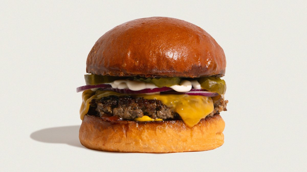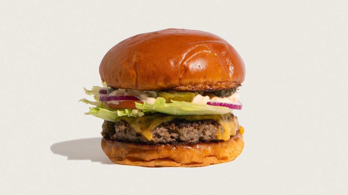 Økologisk burgerbolle, økologisk friskhakket dansk oksekød, ketchup, sennep, løg, pickles, mayo og cheddar.