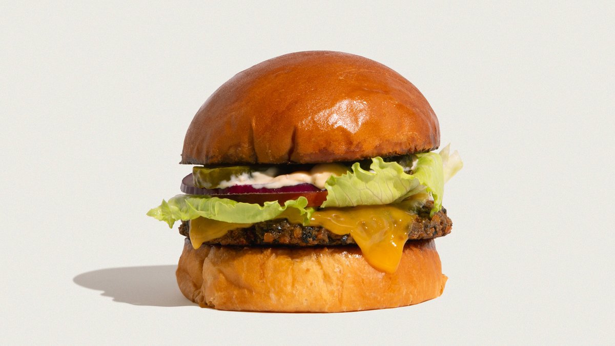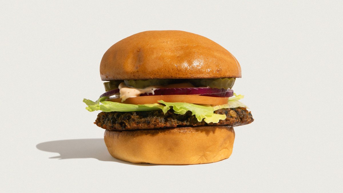 Økologisk burgerbolle, økologisk veggiebøf*, mushroom garum, tomat, salat, rødløg, pickles & vegansk Jagger sauce. *Indeholder gluten