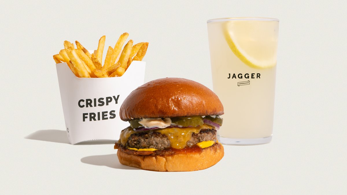 Økologisk burgerbolle, økologisk friskhakket dansk oksekød, tomat, salat og løg. Jagger dip, pickles og cheddar. Serveres med pommes frites, og en valgfri sodavand, vand eller dåseøl.