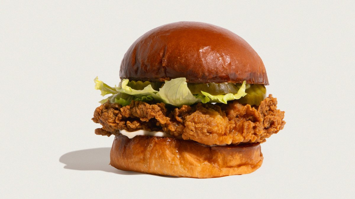 Økologisk burgerbolle, friskpaneret kyllingeoverlår, salat, pickles, mayo & chipotle mayo.