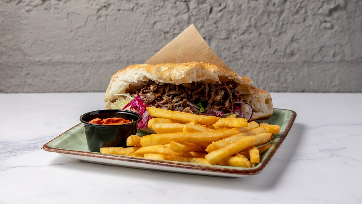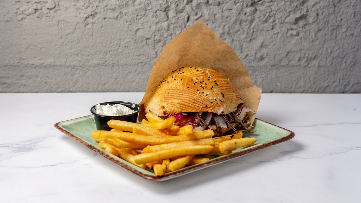 Sprødt fladbrød med valgfri protein, iceberg, tomat, agurk, løg, rødkål, hvidkål, valgfri smørelse og dressing. Serveres med pommes frites, valgfri dyppelse og dåsesodavand.