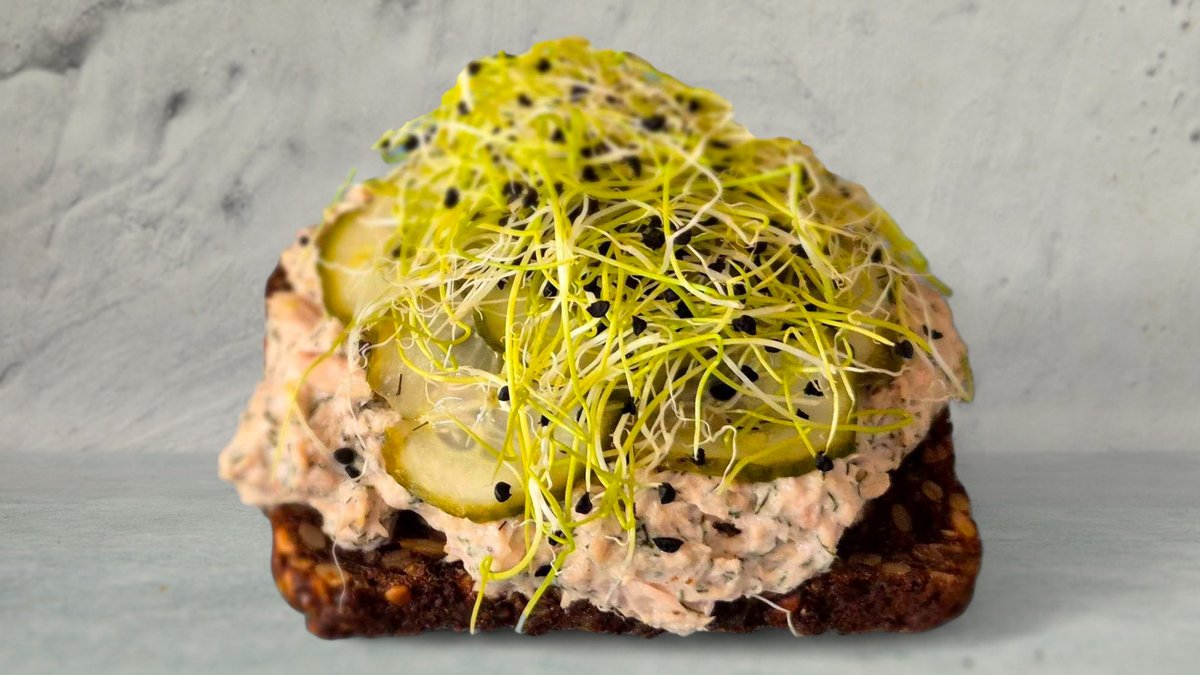 Smørrebrød med hjemmerørt tunsalat, hvidløgsspirer