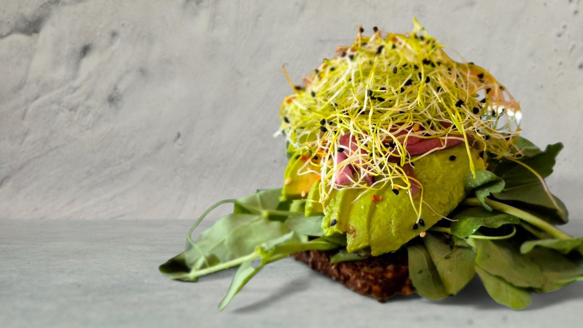 Avokadomad med avokado, hjemmesyltede rødløg, ristede sesamfrø og chili flager, hjemmelavet persille pesto og hvidløgsspirer