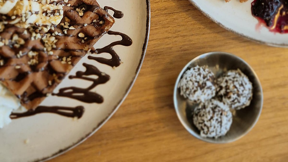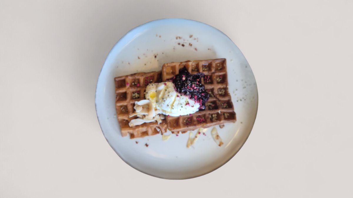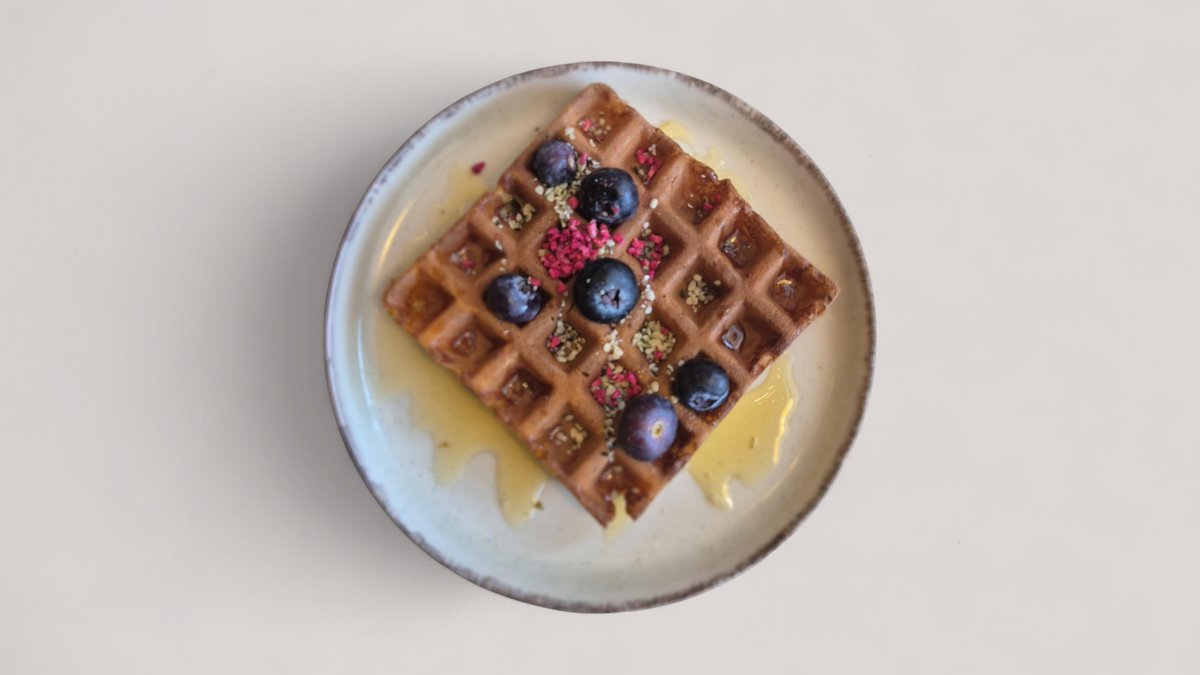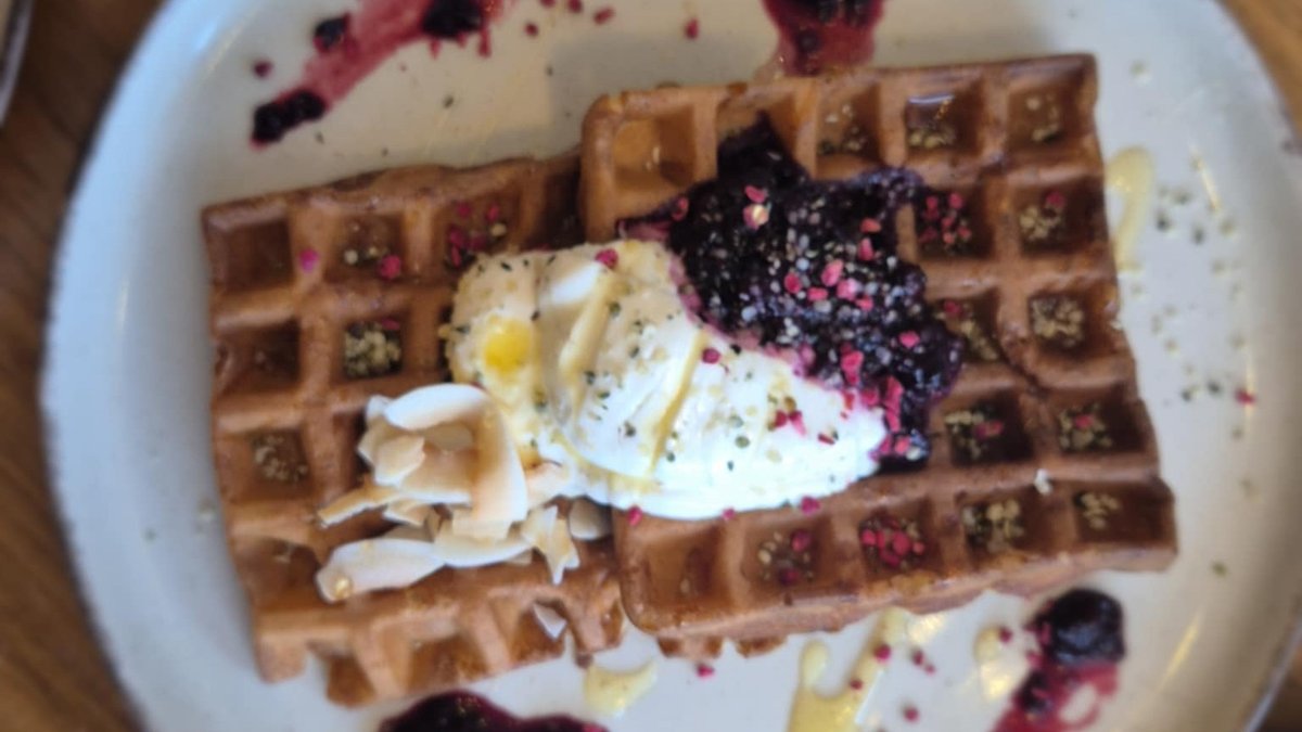 2 stk. Hjemmebagt belgisk vaffel, græsk yoghurt, sæsonens kompot og bær, sirup og kokosflager.