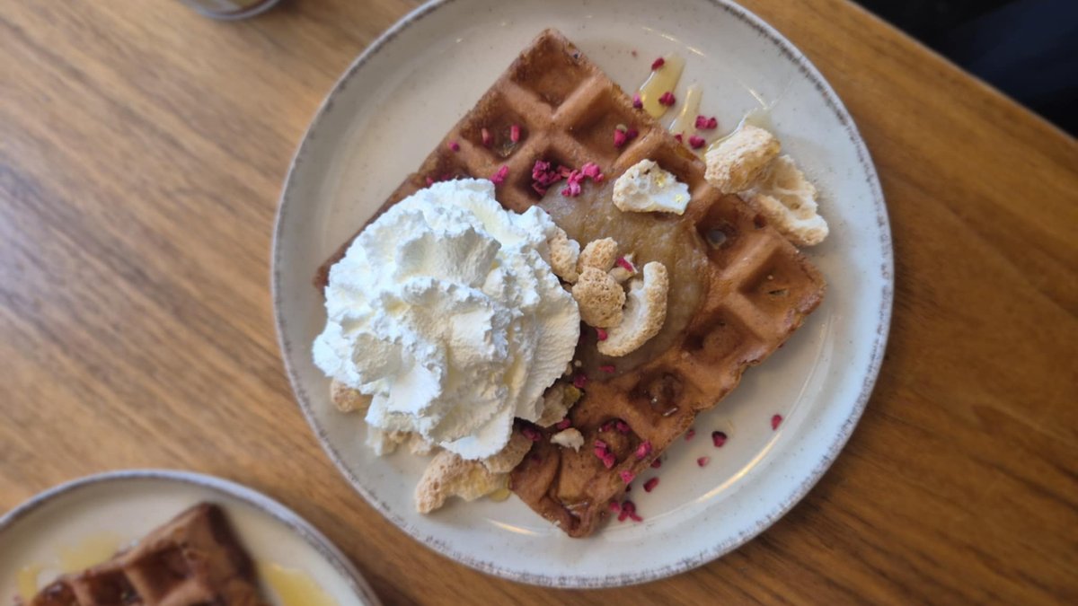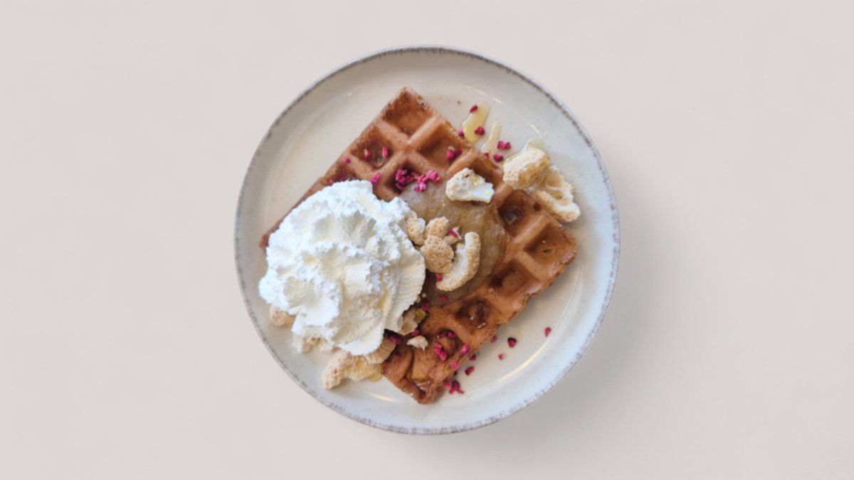 1 stk. Hjemmebagt belgisk vaffel med æblegrød, macroner og flødeskum