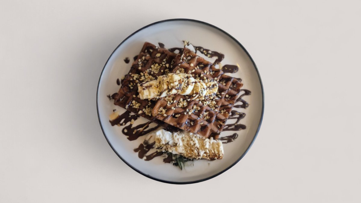 1 stk. hjemmebagt belgisk vaffel med banan, chokolade, flødeskum og ristede hasselnødder.