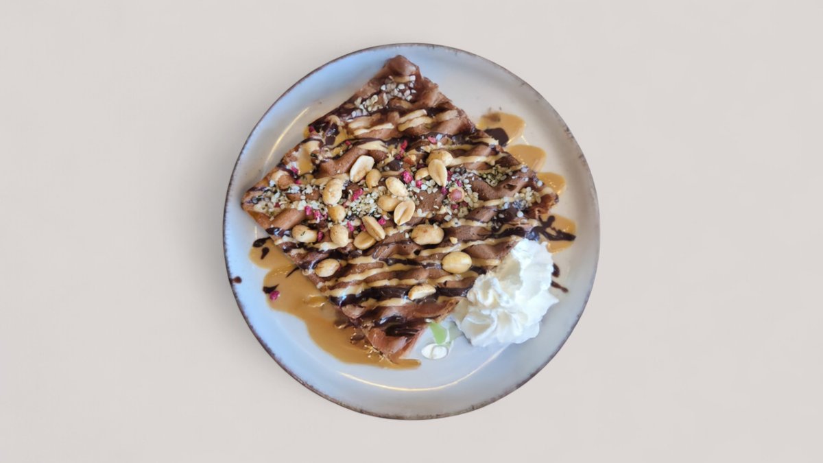 2 stk. Hjemmebagt belgisk vaffel med peanutbutter, chokoladesauce, peanuts og flødeskum