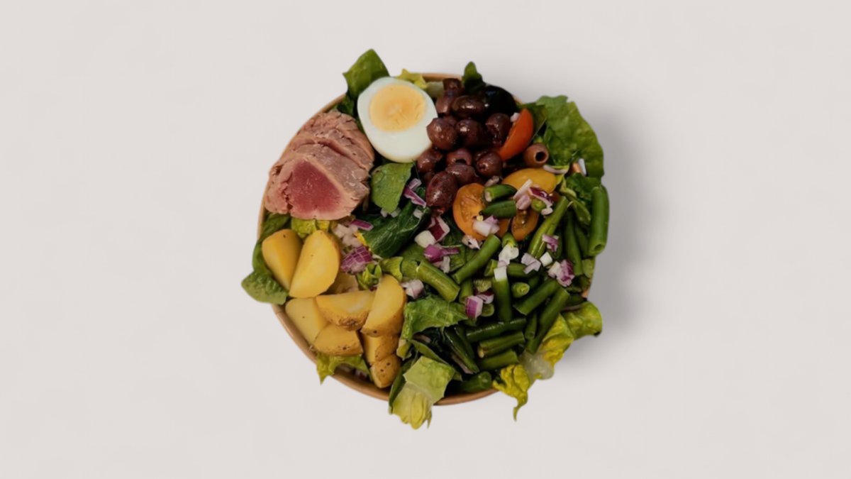 Salade nicoise med lynstegt tun, æg, hjertesalat, grønne bønner, cherrytomt, sorte oliven, rødløg, og nicoise dressing.