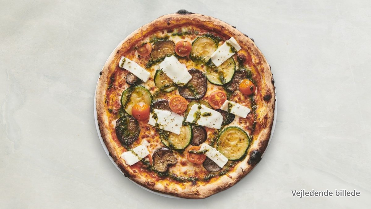 Tomatsauce, mozzarella, artiskok, squash, aubergine, cherry tomater, rucola og pesto.