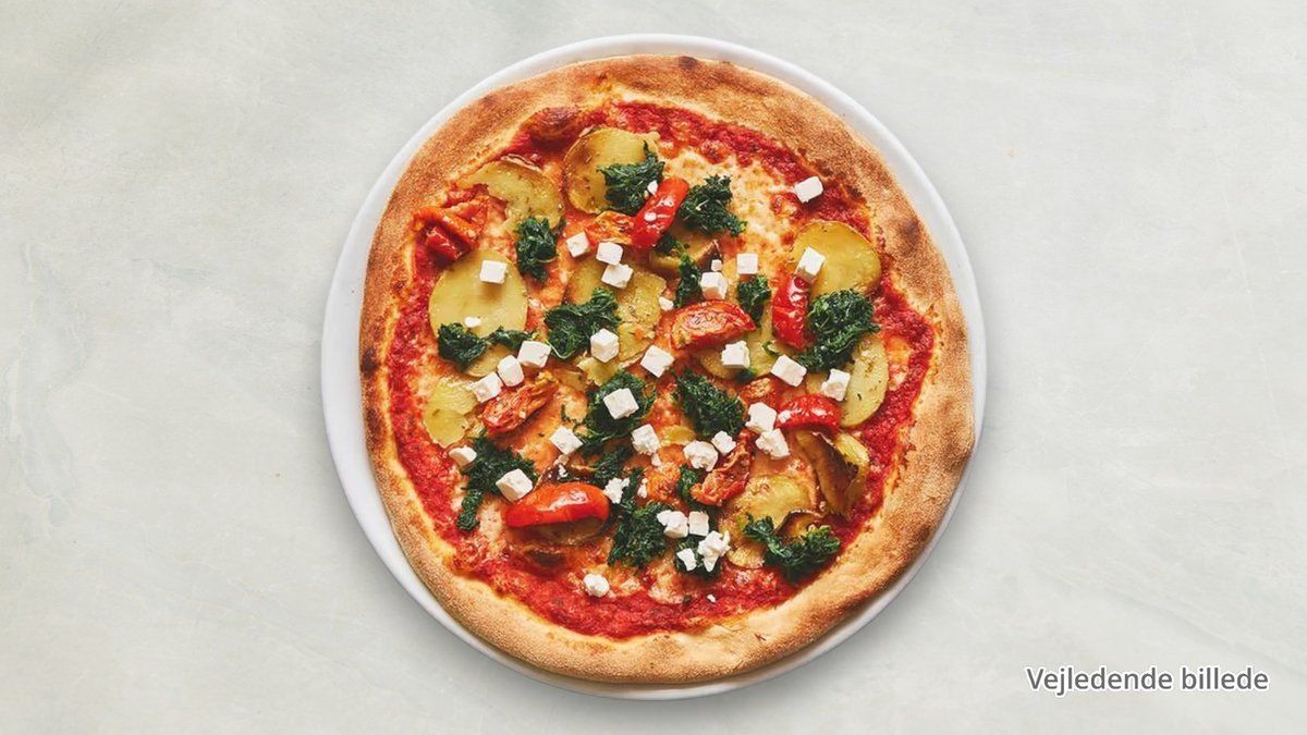 Tomatsauce, spinat, kartofler, feta, soltørret tomater, hvidløgsoile og chili.