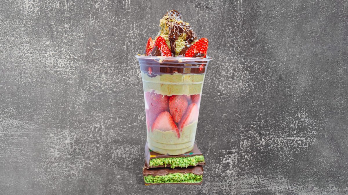 2 stk. pandekager med hjemmelavet pictacie kunafa, Nutella, pistaciesauce, friske jordbær, blåbær og ristede pistacienødder.