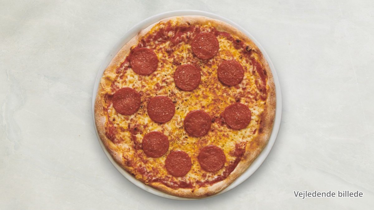 Tomat, mozzarella, salami og oliven.