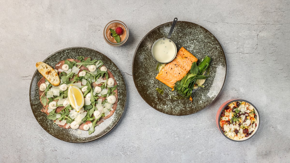 - Oksecarpaccio med rucola, parmesan og trøffelcreme - Ovnbagt laks (150 gram) med creme spinat, citron sauce, marrokansk couscous, stegte grøntsager, kikærter, mandler og tranebær - Valgfri dessert Minimum 10 kuverter