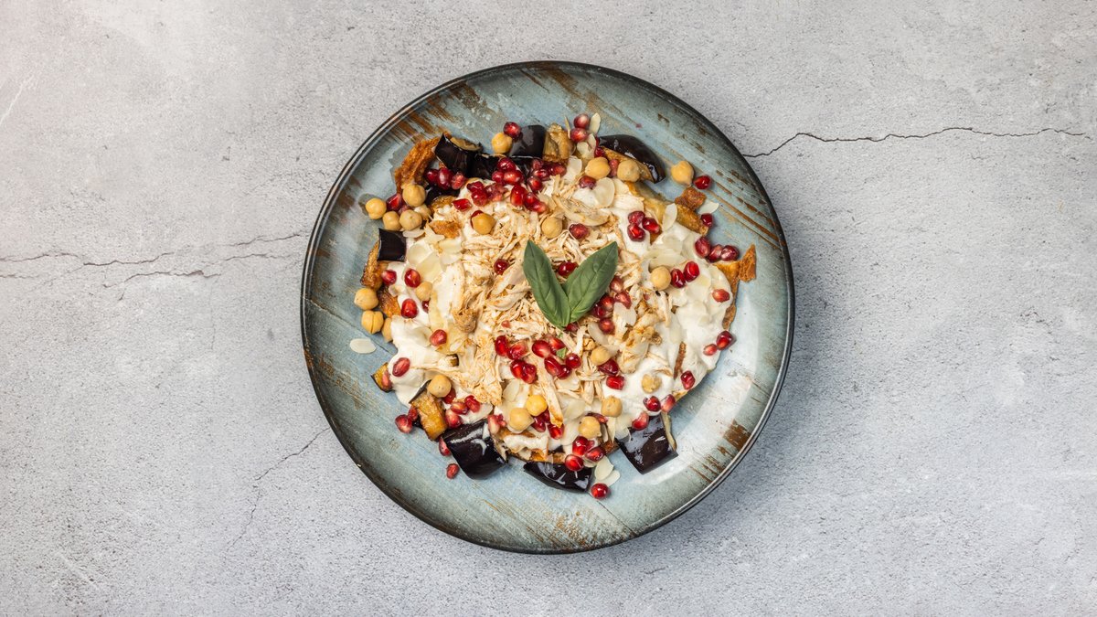 Sprøde pitastykker, creme yoghurt-tahin sauce, kylling og stegt aubergine, toppet med granatæblekerner. Minimum 10 kuverter.