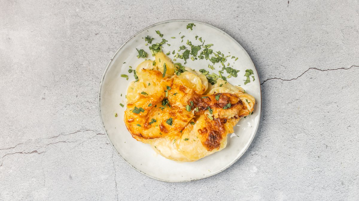 Kartofler, fløde og mozzarella, bagt i ovnen. Minimum 10 kuverter.