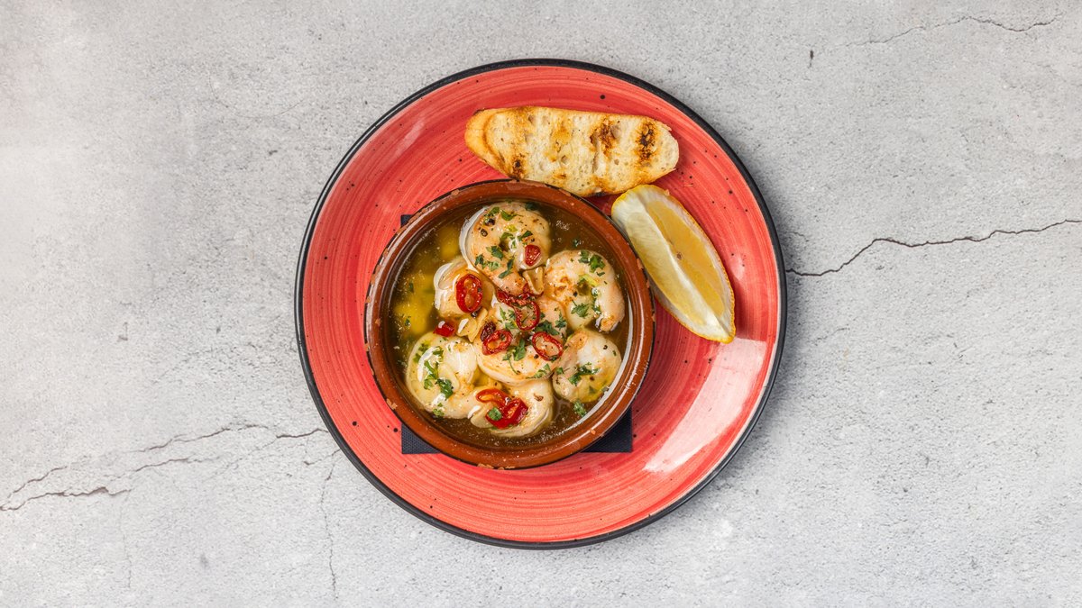 Tigerrejer i olivenolie, hvidløg og chili. Minimum 10 kuverter.