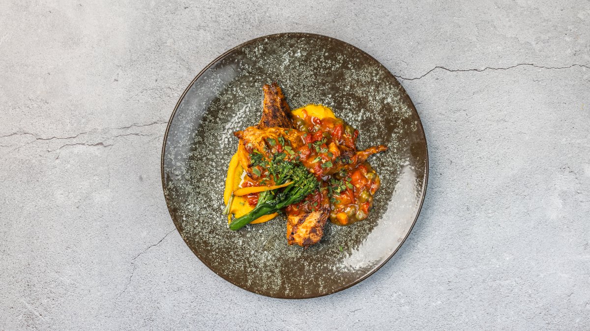 Småretter til deling Kød kroketter af braiseret oksekød Tigerrejer i olivenolie og chili Arancini med mozzarella, parmesan og trøffelmayo Hovedret Braiseret lammeskank med aromatisk lammesky og ristede kartofler Dessert Frit valg af dessert: Gateau Marcel, Hindbær cheesecake, Tiramisu eller Ris a la mande Ønsker du vegetarisk julefrokost menu, så har du desuden rigtig gode muligheder for her at stille sulten med karakter - kan bestilles som vegetar