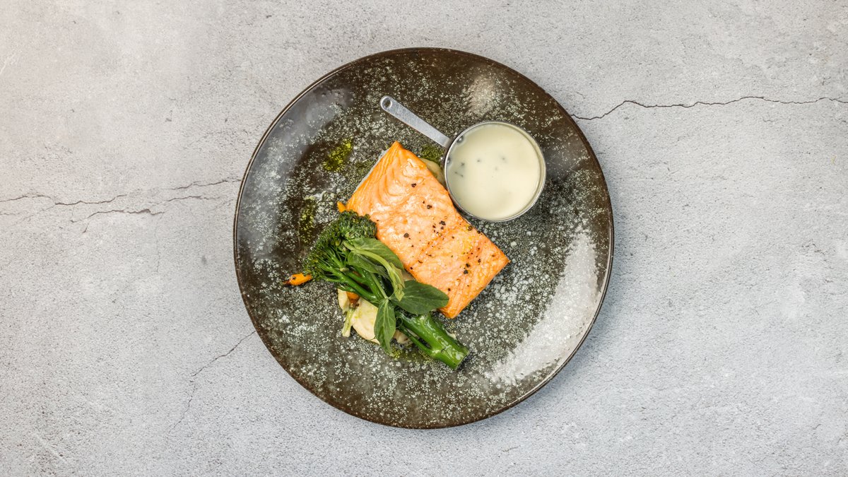 Norskopdrættet laks, ovnbagt med havsalt, citron og dild. Serveres med en cremet spinatsauce. Minimum 10 kuverter.