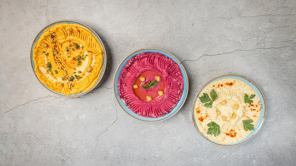 Knuste kikærter med tahini, hvidløg og olivenolie. Minimum 10 kuverter.