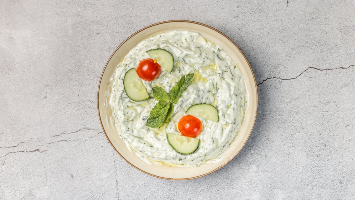 Græsk yoghurt, olivenolie, mynte, hvidløg og agurk. Minimum 10 kuverter.