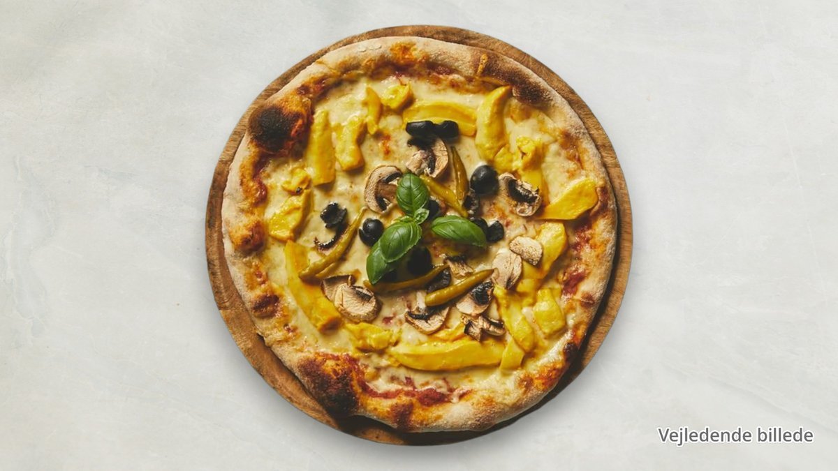 Tomatsauce, ost, pepperoni, champignon og løg.