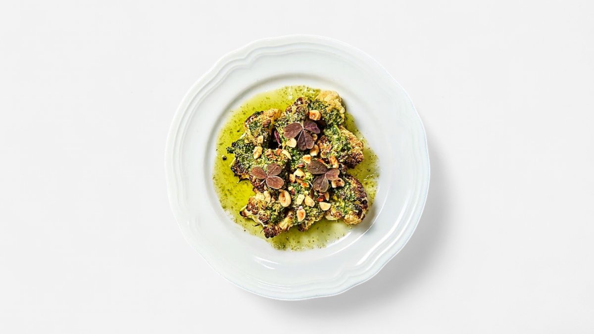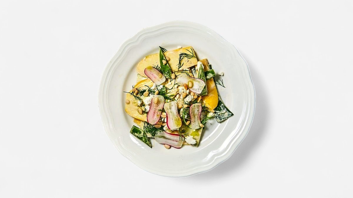 Med sprøde sukkerærter, feta, pinjekerner og dild.
