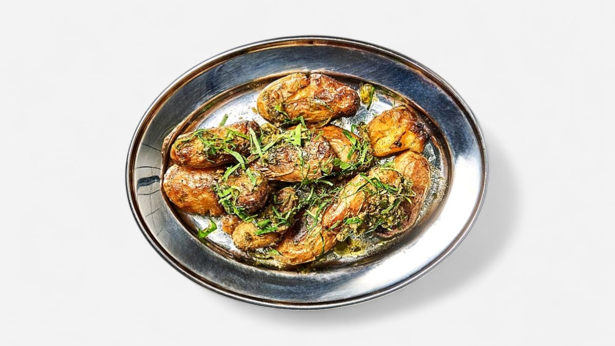 Kartoffelrösti med pocherede æg, grønt, avocado med dildyoghurt og surdejs-toast.