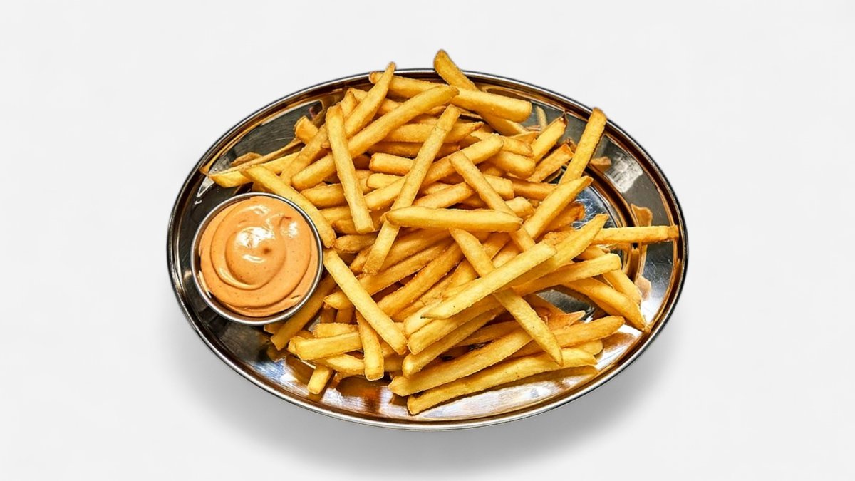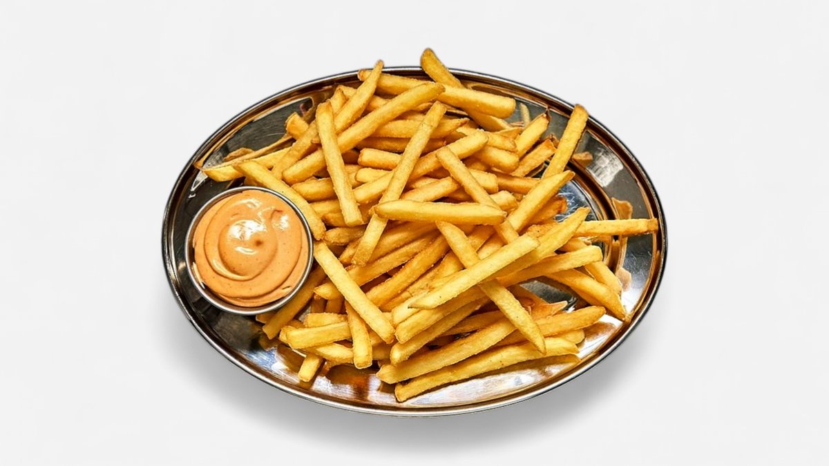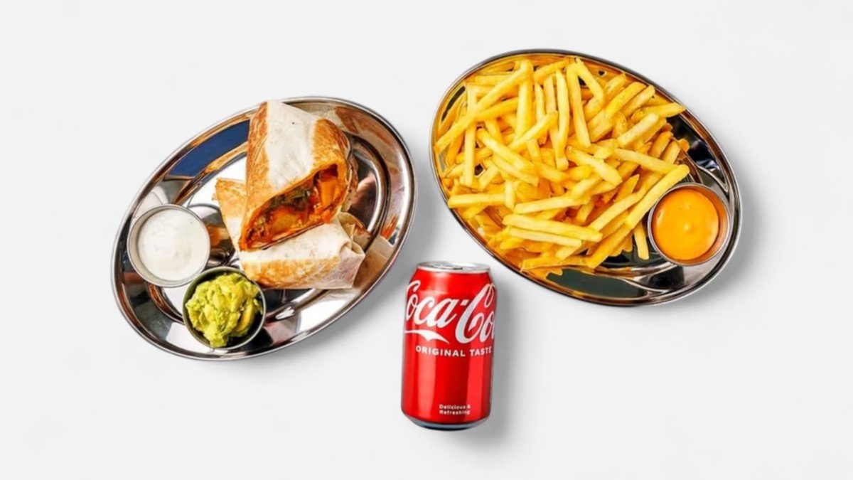 Salat, syltet rødløg, honning, harissa, syltet agurk, trøffelpomfritter og chilimayo samt valg af drikke.