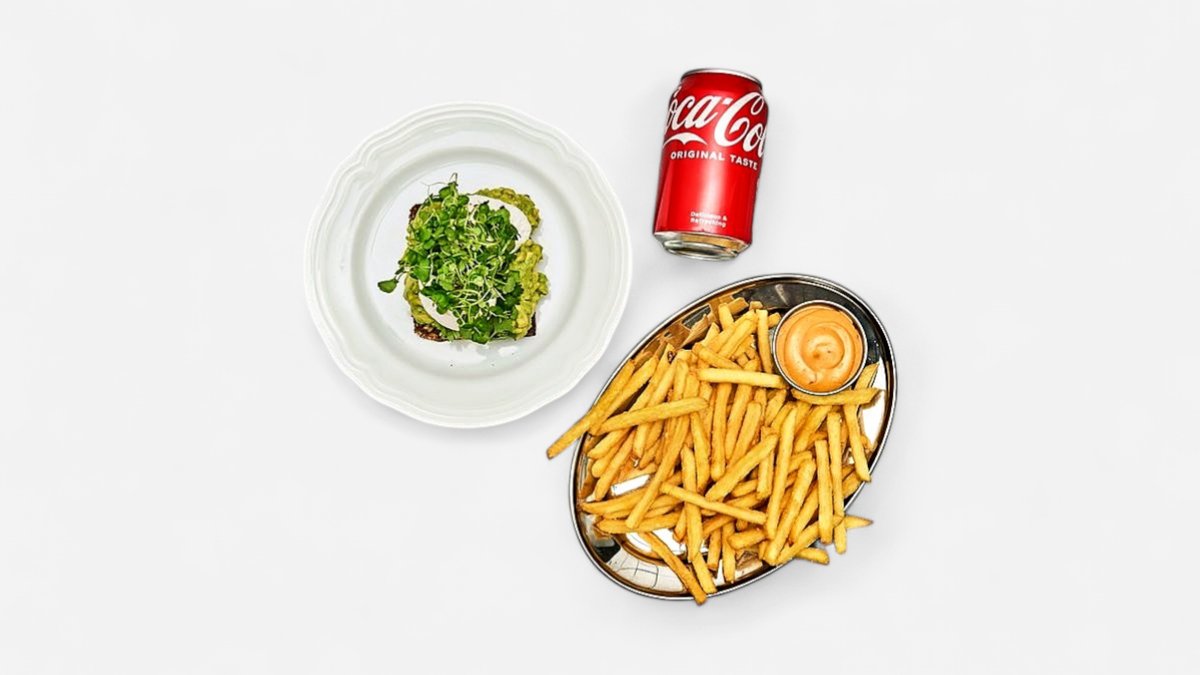 Rugbrød med to pocherede æg, avocado og koriander. Serveres med trøffelpomfritter og chilimayo samt valg af drikke.