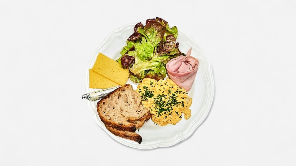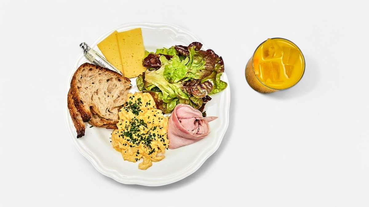 Røræg med cotto di alta-skinke, Søtofte økologisk Søbo-ost, grøn salat og surdejsbrød. Serveres med valg af drikke.