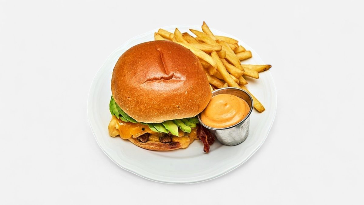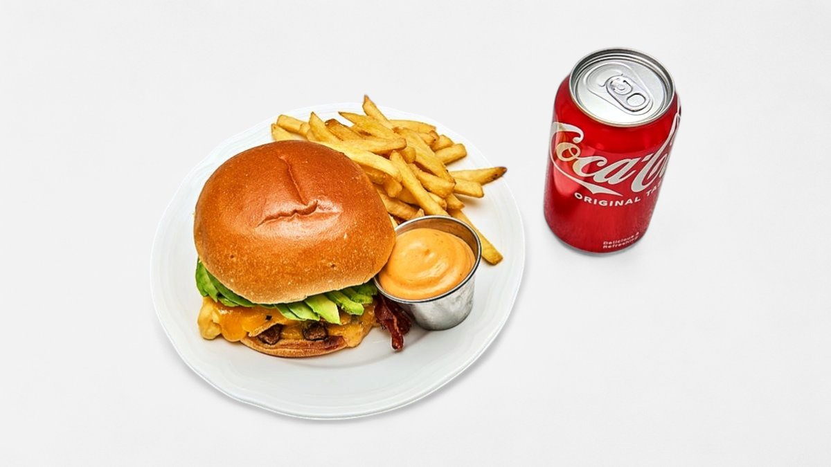 Bacon, pølse, økologiske røræg, avocado og cheddarost i en briochebolle med trøffelpomfritter og chilimayo samt valg af drikke.
