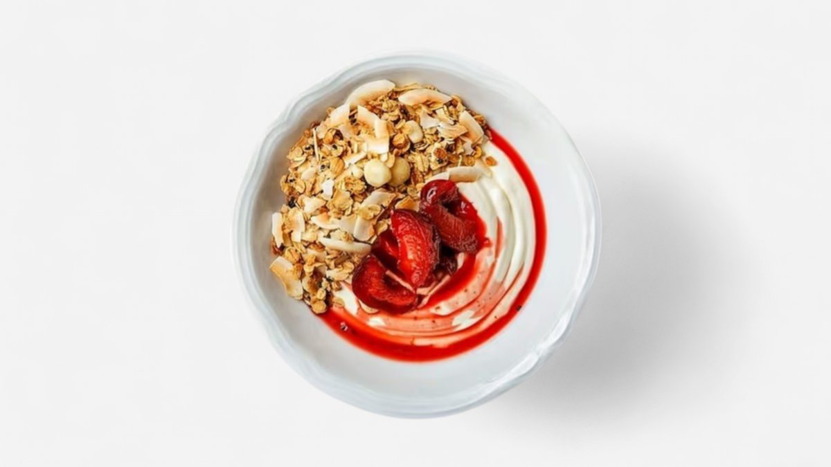 Søtofte økologisk yoghurt, granola, bagt sæsonfrugt.