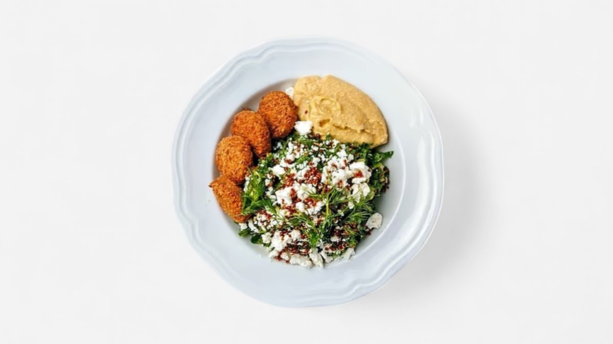 Falafelsalat med grønkål, avocado, belugalinser, fetaost, quinoa og ristede solsikkefrø.