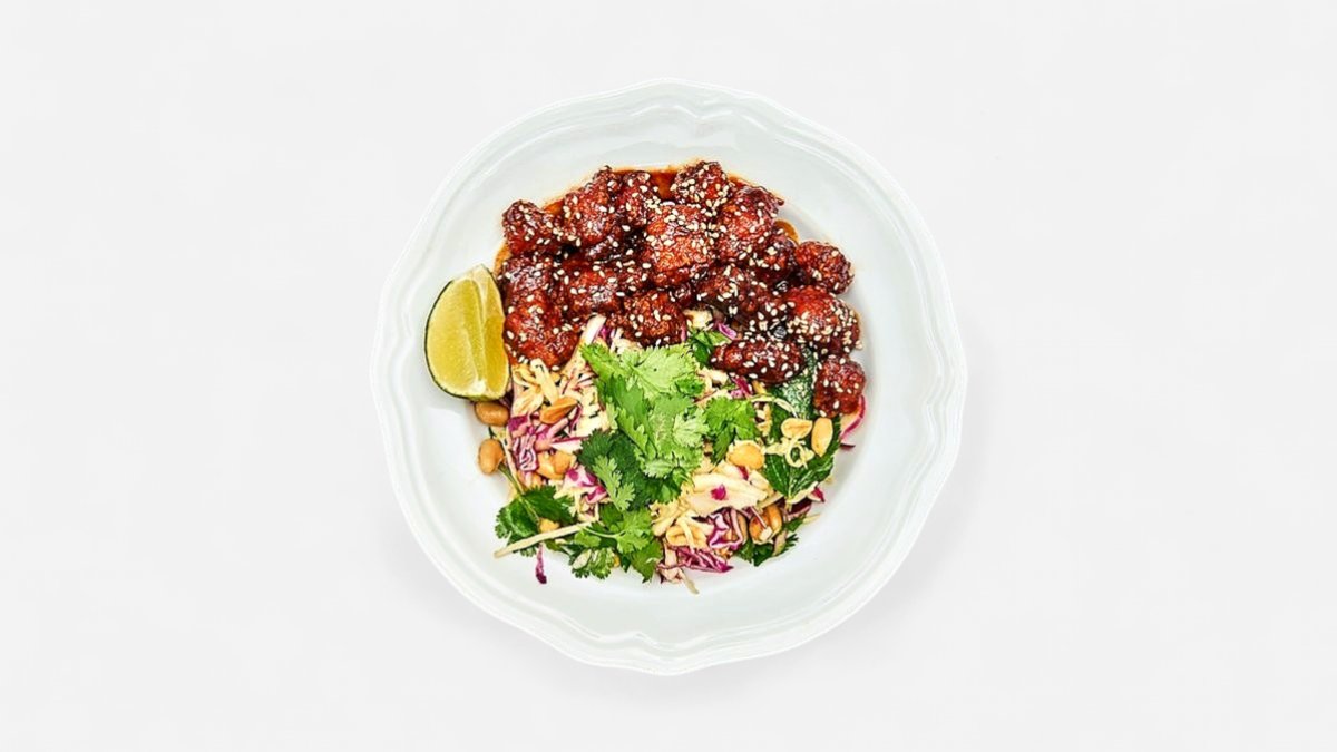 Spicy koreansk kylling med kål, mynte, peanuts og koriander.