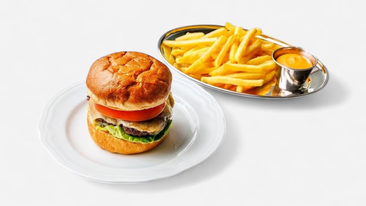 Potato bun, monterey jack, cheddar, syltet rødløg, syltet agurk, tomat og chilimayo med trøffelpomfritter og chilimayo samt valg af drikke.