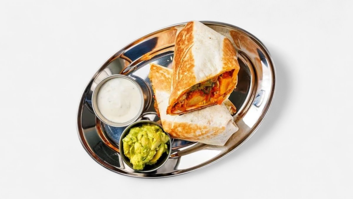Røræg, stegte peberfrugter, kartofler, ost, citronyoghurt, avocado, syltet løg, jalapeño og pico de gallo samt valg af drikke.