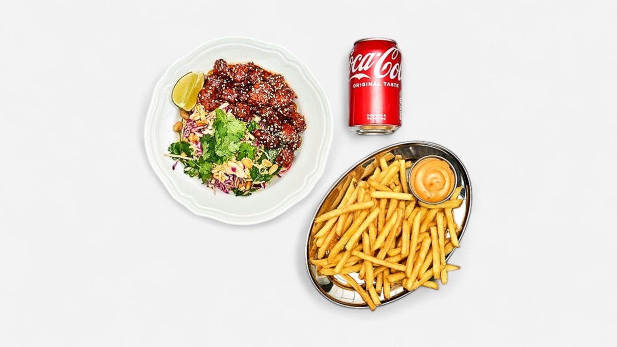 Spicy koreansk kylling med kål, mynte, peanuts og koriander. Serveres med trøffelpomfritter og chilimayo samt valg af drikke.