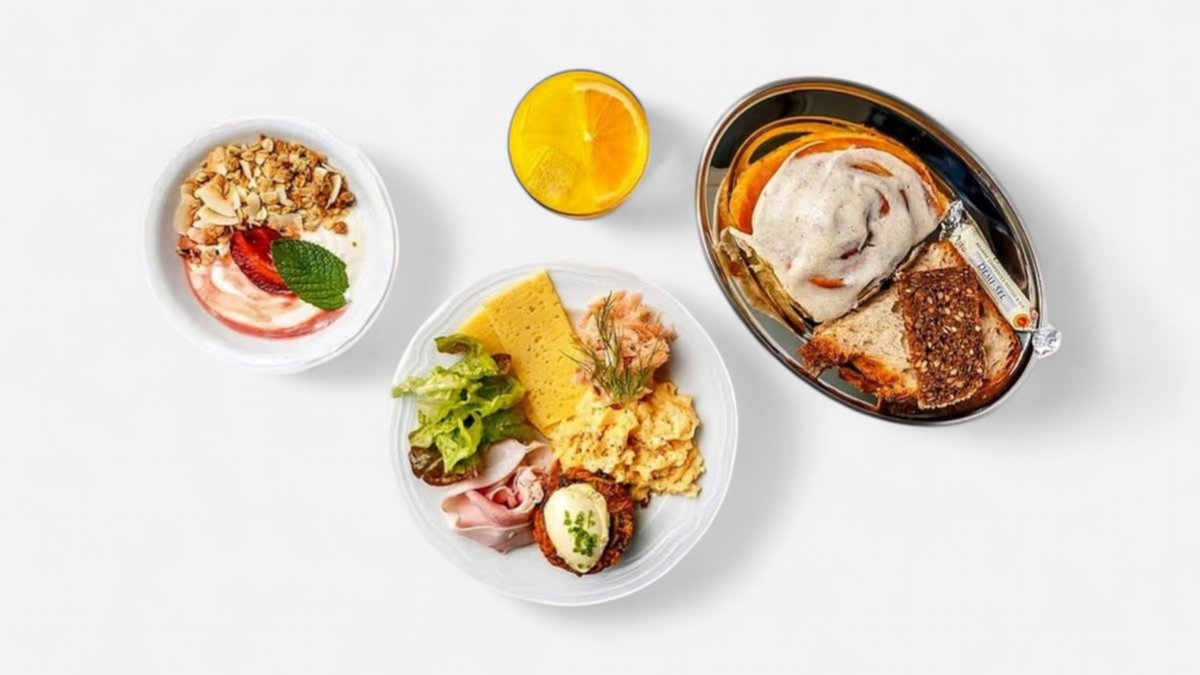 Røræg, cotto di alta skinke, Søtofte økologisk Søbo ost, rösti med Arla Unika creme fraiche, varmrøget laks, grøn salat, Søtofte økologisk yoghurt med granola, bagte sæsonfrugter, kanelsnegl og fransk saltet smør med surdejsbrød fra Andersen & Maillard. Serveres med et valg af drikke.