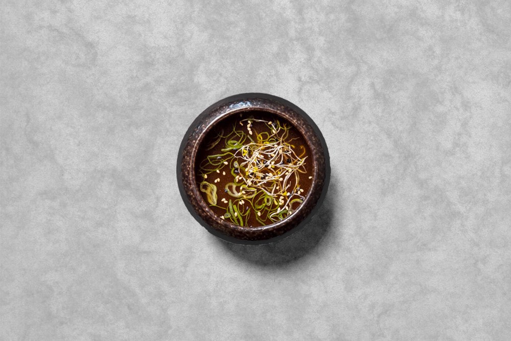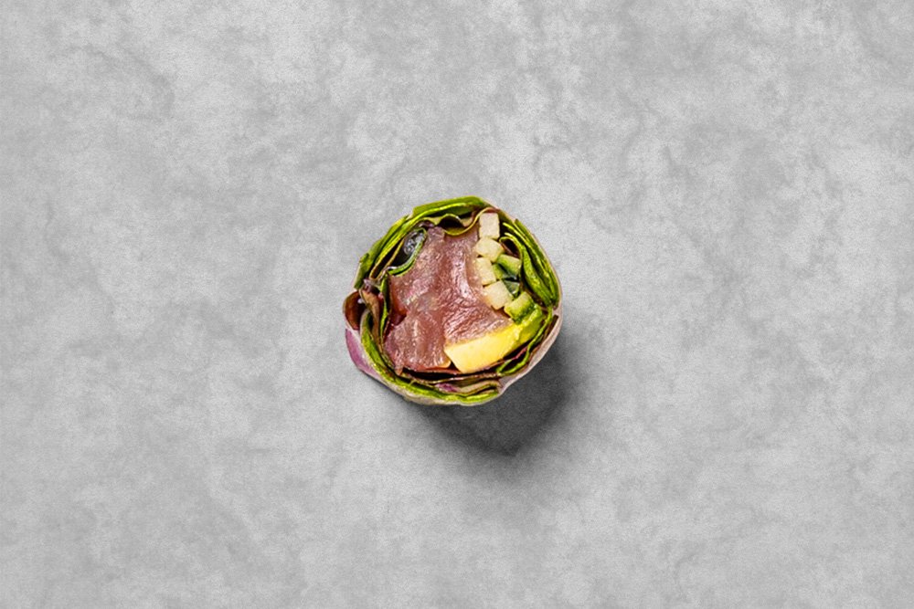 Med fyld af tofu, tang, kimchi, laks, forårsløg og sesam.