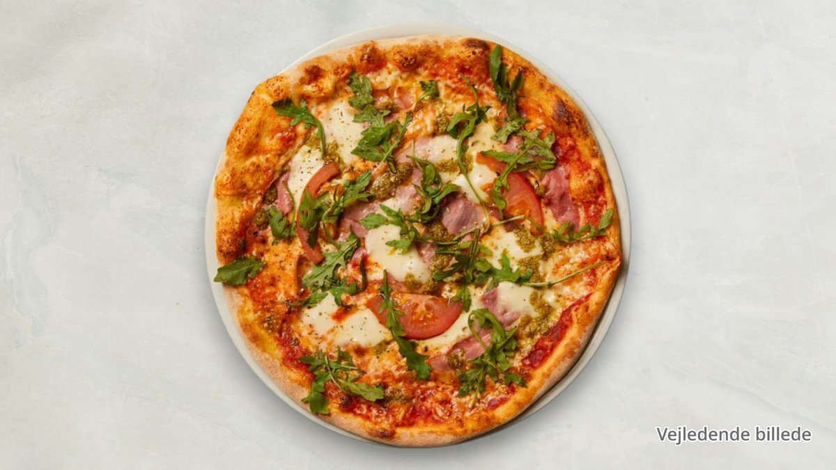 Tomatsauce, ost, skinke og pepperoni.