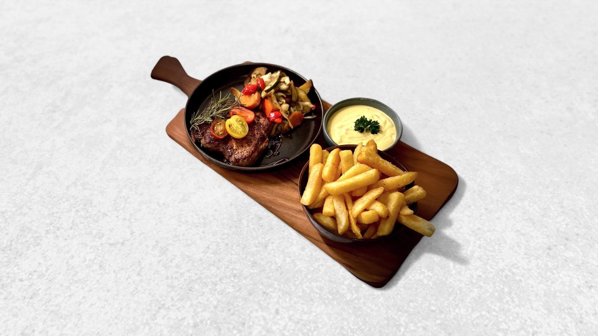 200 gr. oksefilet, grillede grøntsager, champignonsauce. Serveret med valgfri tilbehør