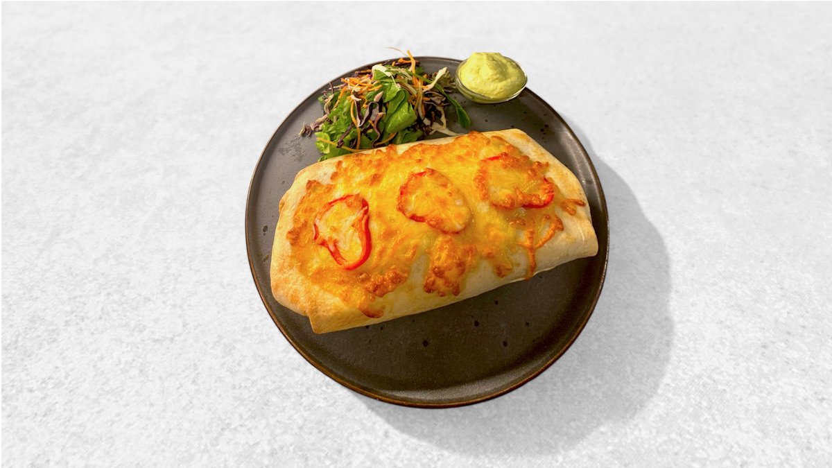 Tortilla med fyld af krydret oksekød, jalapenos, bønner, ris, majs og ost. Serveres med salat.