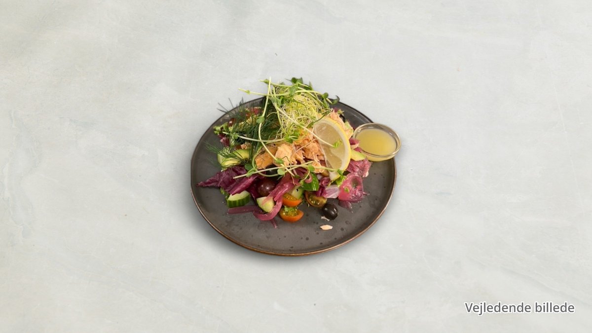 Varmrøget laks, cherrytomater, agurk, syltede rødløg, grønne asparges, sorte oliven, vindruer, blandet salat og citron. Serveres med vinaigrette, brød og smør.