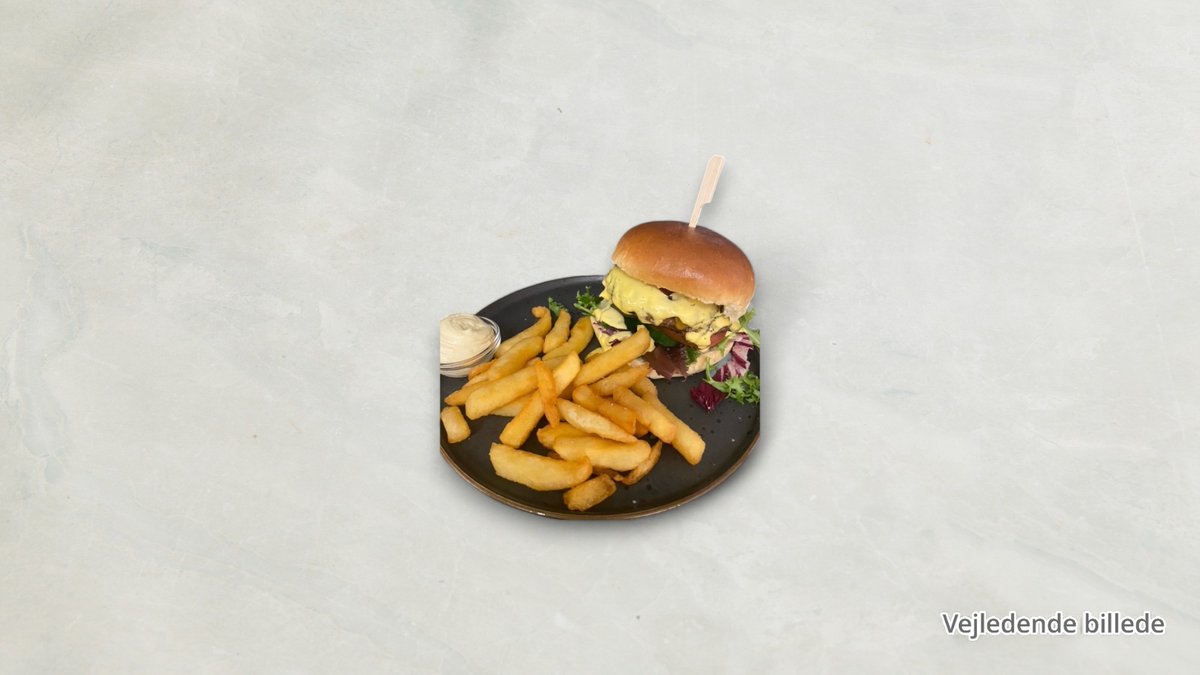 200 gr. hakkebøf i valgfri bolle med fyld af cheddarost, bearnaisesauce, ristede løg, tomat, agurk, salat, mayonnaise. Serveres med pommes frites og én valgfri dip.