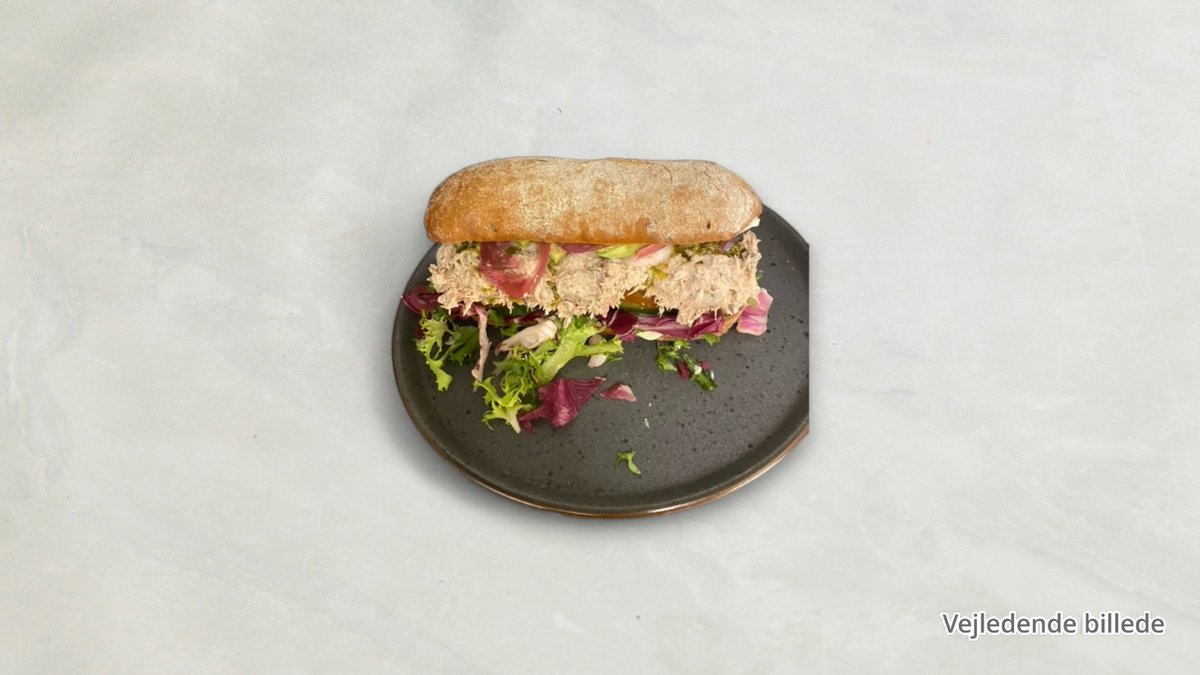 Mørkt sandwichbrød med fyld af tunmousse, rejer, salat, tomat, agurk, syltede rødløg. Smurt med mayonnaise.