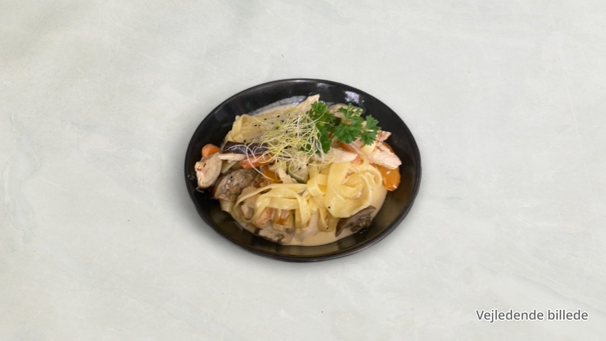 Pasta vendt i cremet flødesovs, oksefilet, svampe, hvidløg, cherry tomater og urter.