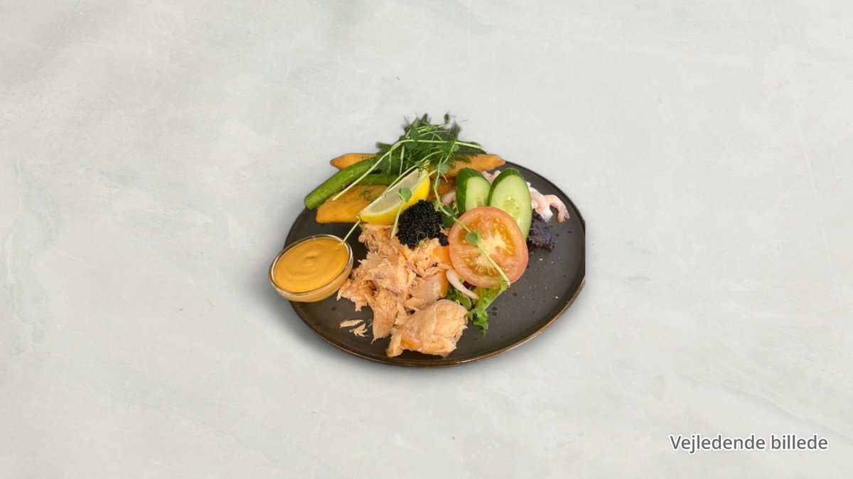 Hjemmelavet tunmousse, rejer, cherrytomater, agurk, majs, syltede rødløg, sort oliven, blandet salat, Serveres med vinaigrette, brød og smør.