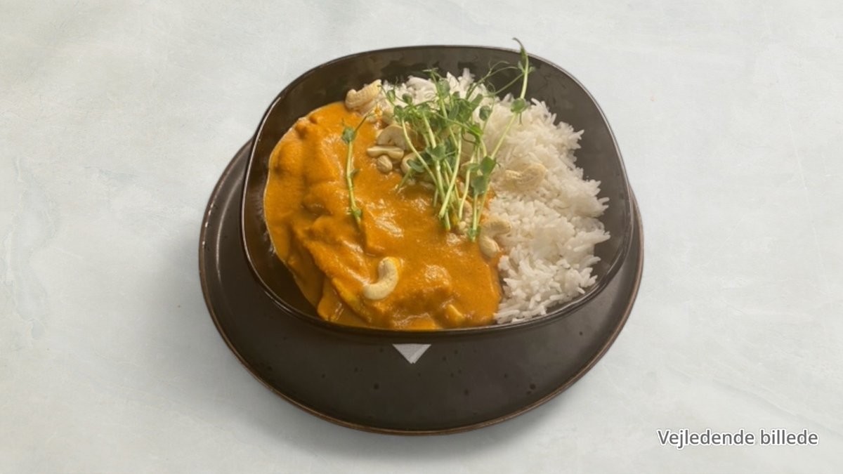 Marineret kylling i en krydret tomatsauce med cashewnødder, smør og fløde. Serveres med basmatiris.