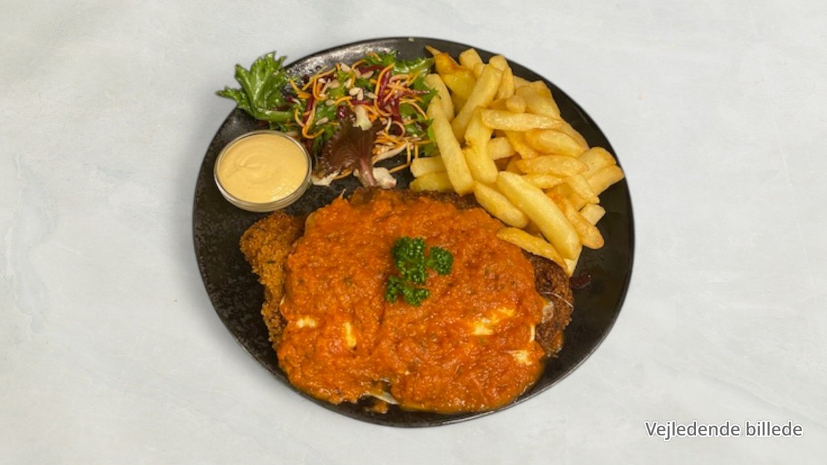 Paneret kalveschnitzel ovnbagt med tomatsauce, lufttørret skinke og mozzarella. Serveres med én valgfri tilbehør.