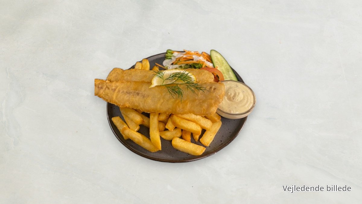Pollock-filet paneret i tempuradej og friturestegt. Serveres med pommes frites, hjemmelavet tartarsauce, citron og salat.